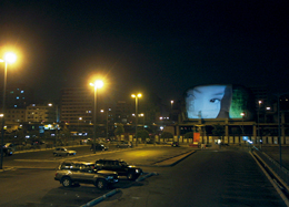 Fabiao's cinematic intervention marks the second event in the annual Beirut Street Festival. Every September, the loose-knit local cultural foundation that is Zico House stages a series of public performances and happenings for the purpose of bringing the arts to the streets. This year, Zico (aka Moustapha Yamouth) and his co-conspirator Rola Kobeissi decided not to stack the deck with a concentrated month-long program but rather to stretch the festival out over a year. The results are more autonomous events with a higher profile and international reach. Fabiao's project teams Zico House with a similar not-for-profit arts organization in New York called White Box, and takes sponsorship from both Virgin and Solidere (the private real estate company that owns the plot on which the bubble stands). Though the bubble was slated for demolition a year ago, Solidere has since commissioned architect Bernard Khoury to rehabilitate the building as a mixed-use cultural and commercial center. Work has already started, and while the designs are still subject to a few last minute tweaks, Khoury hopes to be finished by May 2005. In the meantime, a project like "Transitio" does much to animate the site and highlight its potential. By day, the bubble has a monumental aspect. The shape of the building set against the vast empty space that surrounds it commands awe and attention. But by night the bubble retreats like a ghost. It stands on a dead zone, after all, with no lights to illuminate it and no activities to bring it back to life. Fabiao has changed all that, albeit fleetingly. From a distance, it is a stunning sight to see scenes from her films flickering across the ravaged skin of the bubble. And unlike so much of the restoration work that characterizes downtown Beirut, Fabiao's project is neither pat nor pretty. Rather, with its jerky movements and handheld angles, it is hectic, a little rough, and thoroughly contemporary. "It was my dream to white-wash the entire building," says Fabiao, sitting in the parking lot in front of the bubble last Thursday night, herself decked in white, beer in hand, and perched on a white plastic chair filched from the nearby valets. "Solange, you have to pay to park here," jokes the perpetually fanny-packed Zico, as an oversized Mercedes tries to muscle into the vacant parking spaces where a clutch of viewers - on chairs and without cars - have set up camp to watch the projections. Among those in attendance are Fabiao, Zico, Kobeissi, the architect Stephen Holl and the artist Nadim Karam. It's a fitting assortment of onlookers, in that they are all, in one way or another, committed to the idea of public art as a vital component of city living. Holl is building Beirut's new marina, and his design scheme includes five platforms for public sculptures and site-specific installations. Karam is the force behind the "Archaic Procession," a series of enormous sculptures that he moved periodically around the city back when downtown really was little more than a wasteland. Fabiao, who was born in Rio de Janeiro, started the "Transitio" project in 2000, when she took a long (and no doubt wallet gauging) cab ride from 228th Street, on the edge of Manhattan and the Bronx, all the way down Broadway to Wall Street. She filmed the entire ride, and the unedited film that resulted was "Duration: 1 Hour, 3 Minutes, 17.3 Miles," one of the films projected onto the bubble last week. Fabiao describes "Transitio" as "a global dialogue, a city within a city." To date, she has shot footage in nearly 10 cities, including Beirut, Istanbul, Mexico City, London, and Paris. The idea is to bring images of one city into another. "I like the combination of the two dynamics," she explains. "It's about the relationship between cities. So maybe you bring Beirut into Sao Paulo or Shanghai into Chinatown in New York." Pairing Beirut with New York on one end and Shanghai on the other was not entirely incidental. "The idea of east and west is so central in Beirut," suggests Fabiao. Fabiao has presented "Transitio" in New York, Mexico City, and a tiny town in northern Finland called Tornio. All three shows took place indoors as video installations. Her Beirut showing, therefore, marks the first time Fabiao has been able to mount her project outdoors in a public space. Trained as an architect and a set designer, Fabiao first entered the realm of contemporary art as a painter, before discovering video art. Now, she is a sworn convert who is rarely without her camera. "The whole system of filming is based on randomness," she says. "How we select images is not based on a storyboard. It's both conscious and unconscious. The conceptual part of this work is to contemplate something from afar. It's not about presence and absence but about presence and distance and virtuality. It's also about the amount of information we absorb, which eventually leads to some story or an infinite number of possible stories." Having moved from Brazil to Berlin in 1989, Fabiao has had prior experience with a city in the throes of reconstruction. "I moved there right before the fall of the Berlin wall. I stayed for five years. I saw the reunification of the city," she says. "But ultimately, I didn't feel German enough to help rebuild the city." After a bit of soul searching over whether or not she should return to Brazil, she settled for New York, where she has lived and worked since 1994. Of course, she still travels constantly, and whenever she lands in a new city, she tends to pull out her camera to film before doing anything else. "It's always my first experience with a city," she says of her work. "It's my first exchange - my desire to go through and discover the city in that way." "Transitio" is projecting itself on the Beirut City Center Building and beside the Virgin Megastore every night from 9 p.m. until 12 a.m. through Friday, Sept. 10 |