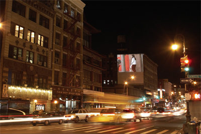 View of Solange Fabião’s video projection Transitio_NYC, Oct. 20-31, 2005; at the corner of Canal and Center Streets |