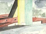 The new center for the town of Vuosaari is a double tower forming a gateway on a raised plaza facing the horizon of the Gulf of Finland. The tilt of the earth's axis, 23.5 degrees, defines the geometry of the towers. (T.23.5° and T.90°) Vuosaari, near Helsinki, the northern most metropolis on earth, is a place where the northern end of the earth's axis always points to the same place (North Star.) |