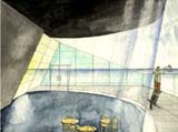 - an observation level "Polaris" cafe on T.23.5° - an inside-outside terrace with "Diurnal Circles" stairs - a "blind room" arrival area with computer screen exhibits dedicated to the motions of the earth and time - a wooden sauna topped by a helicopter pad (on the T.90°) - Hinged-Space Apartments. |