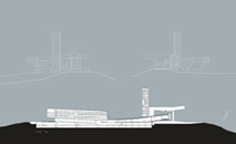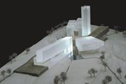 Engine of Culture. Rather than an "Acropolis" (which transmogrifies into a Necropolis), our new City serves as an active integral "catalyst" for Galician Culture past, present and future.The production of cultural works are driven by the engine of research and teaching areas. A Sound-Image Institute replaces Sound-Image Library. Research rooms, workshop studios and teaching areas provide dynamic ongoing cultural activities. The main force of the "Engine of Culture" concept, the studio tower, contains resident lofts for writers, scholars, composers and artists. These studios provide Galician scholars and artists with a facility to directly invigorate culture. The different disciplines - normally separated in other institutions - are integrated in this central glass tower. At the bottom the tower connects to the Libraries, Sound and Image Institute, and Museums, while at the top it rises to a "Sky Chapel" facing Santiago. |
