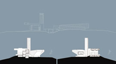Access/Entrances. Santiago de Compostela and the City of Culture are connected through a new pedestrian bridge strung across the valley in a delicate bend. This new link is the most vital: an umbilical cord connecting the ancient and new. Pedestrians arrive at a new sky-lit grotto below the central reflecting pool of the "Open Center." Ceremonial receptions and opening events will take place here. Arriving by freeway, ceremonial drop-off is on the east. This main entrance connects to the grotto entrance in one large lobby and service area. Tickets, coat check, and a computerized orientation for every activity in the Cultural City can be accessed from this main lobby area. Parking is located under the sports fields on the southeast. | |||||||||||||||||