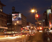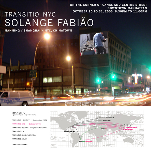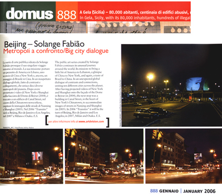 Metropoli a confronto / Big city dialogue - DOMUS 888 The public art series created by Solange Fabião continues its unusual journey around the world. Its mission: to bring a little bit of America to Lebanon, a glimpse of China to New York, and again, a taste of Brazil to China. In an unexpected dialogue of contrasts and connections, uniting ten different cities across the planet. After having projected videos of New York and Shanghai onto the façade of the Dome in Beirut(in 2004), the next stop was a building in Canal Street, in the heart of New York's Chinatown, to accommodate images of streets in Nanning and Shanghai(in 2005). In 2006 "Transitio" it will be the turn of Beijing, Rio de Janeiro and Los Angeles; in 2007 Milan and Osaka. E.S. |