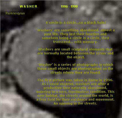It is very curious to hear the comments of people who have seen the photographs.They begin to see washers around the world and they get really excited. They report their excitement to me and sometimes they even bring the washer as a gift. That kind of behavior shows me how a work of art may expand from its first form, in this case photography/sculpture, to an Artistic Field. Post ready-made Transformalism Sculptural Washer |