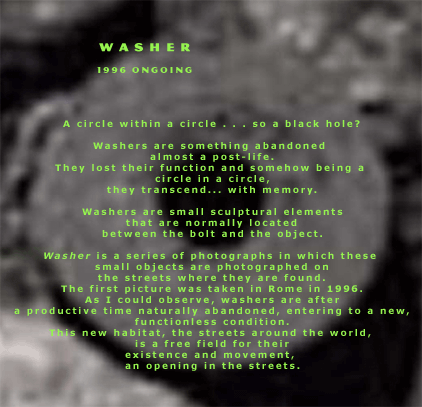 It is very curious to hear the comments of people who have seen this series of photographs. After seeing the images, awareness, a link in the mind is created and being so encounters turn to be possible. They report their encounters with excitement sometimes even bringing the washer as a gift. This kind of behavior shows me how a work of art may expand from its first form, in this case photography/sculpture, creating an Artistic Field around the globe. Post ready-made Transformalism |